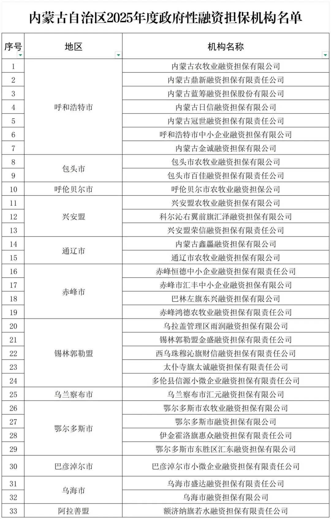 內(nèi)蒙古自治區(qū)財(cái)政廳 地方金融管理局關(guān)于內(nèi)蒙古自治區(qū)2025年度政府性融資擔(dān)保機(jī)構(gòu)名單的公示